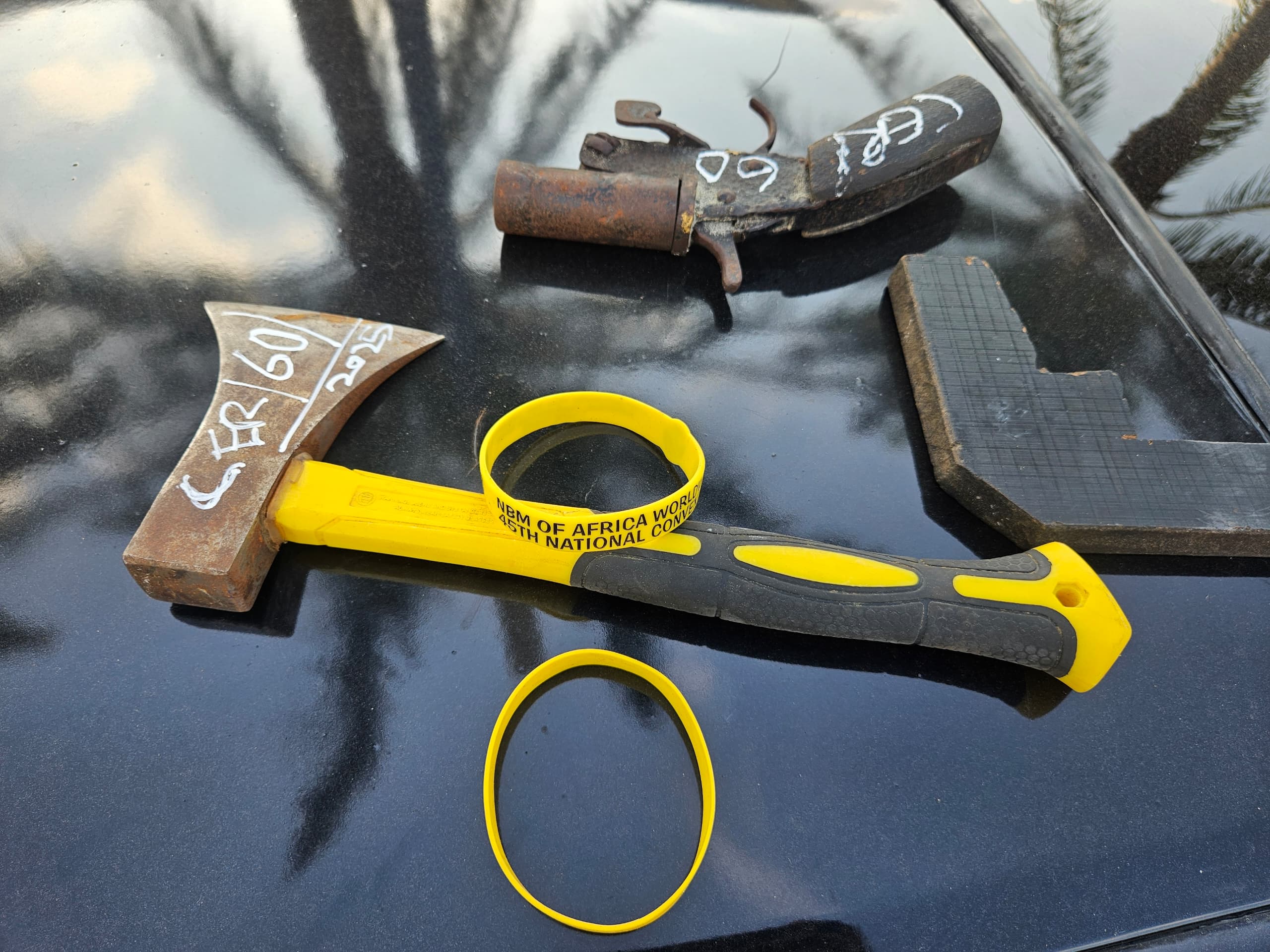 A thorough search of the car led to the discovery of a locally made cut-to-size gun, two yellow hand-bands inscribed with “NBM” (Neo Black Movement), a battle axe, a wooden pistol, and other items hidden within the vehicle’s door compartments.